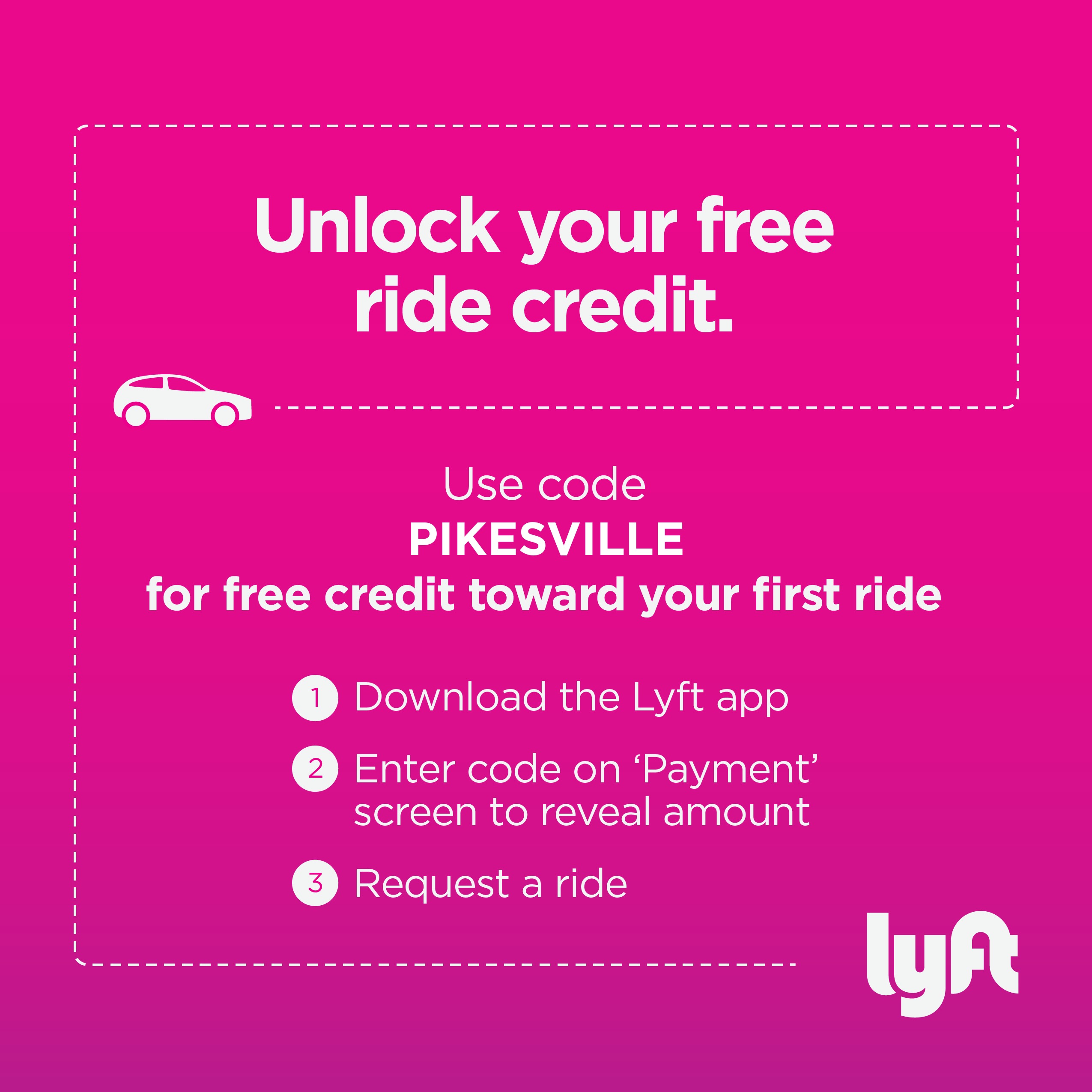 Try getting a Lyft today! Download the app from the App Store or Google Play, then get a $20 ride credit by signing up with the code PIKESVILLE. Want to earn up to $35/hour as a driver? Email us for details and how to get a $50 signon bonus!