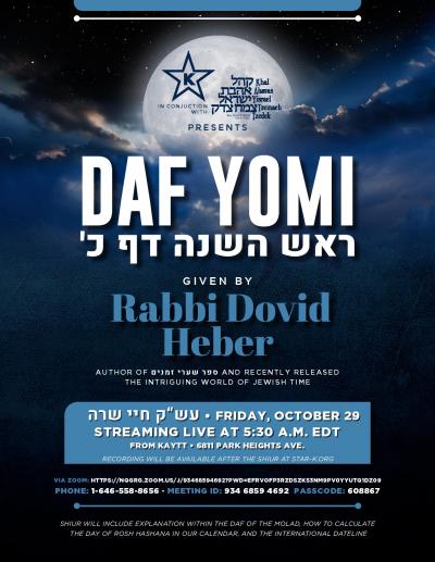Baltimore, MD - Oct. 28, 2021 - Daf Yomi tomorrow is Rosh Hashana 20. Listen to Rabbi Dovid Heber teach the daf and explain all the calendar and dateline concepts! Even if you don't "do the Daf" you'll find this extremely  intriguing.